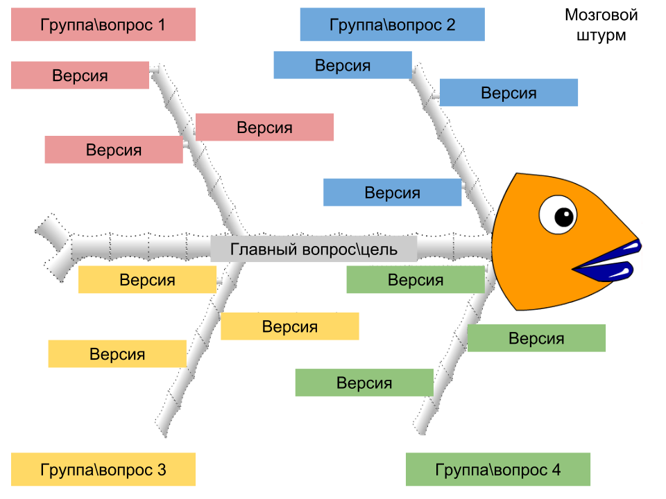 Основой для схемы является рыбий скелет. В голове скелета – проблема, которая рассматривается в планируемом проекте. На самом скелете есть верхние и нижние косточки. На верхних косточках отмечаются причины возникновения проблемы, на нижних выписываются факты, подтверждающие наличие |